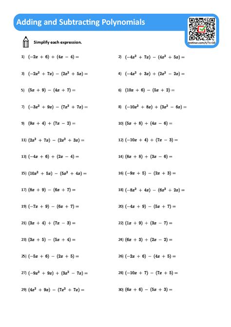 It reinforces them to distribute the negative. Web use this math worksheet to explore polynomials in detail and learn how to find their sum. Web this is a worksheet that has students add and subtract polynomials and then match their answers to the correct simplified expression.